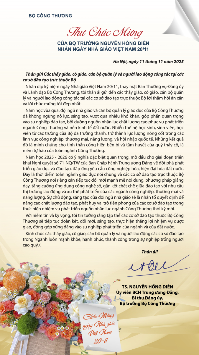 Thư chúc mừng của Bộ trưởng Nguyễn Hồng Diên nhân Ngày Nhà giáo Việt Nam 20/11 11 tháng 11 năm 2025 412 lượt xem Thư chúc mừng của Bộ trưởng Nguyễn Hồng Diên nhân Ngày Nhà giáo Việt Nam 20/11 Chia sẻ: 412 lượt xem